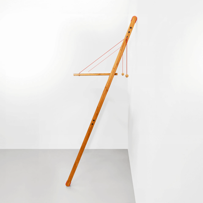 A wooden structure leans against a white wall, featuring horizontal wooden slats, red strings, and a small shelf holding a book and a dark bowl